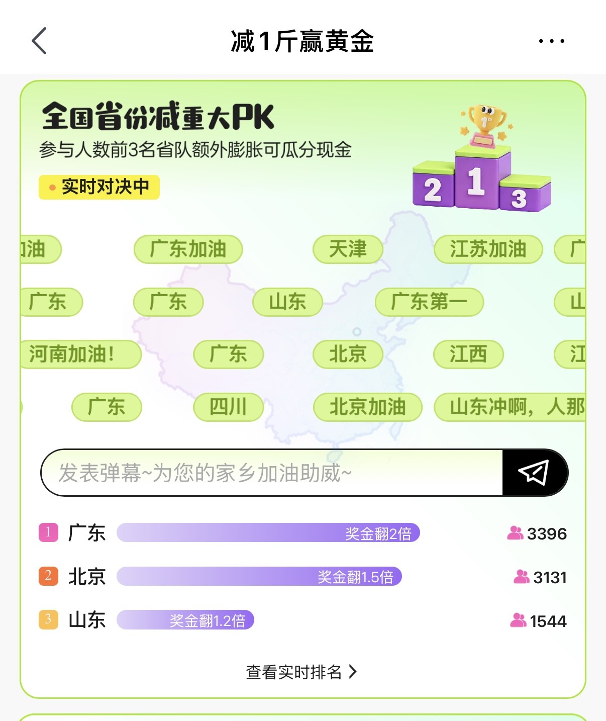 4月15日上线的全国省份减重大PK,将个人减重与集体荣誉深度绑定。活动期间,京东健康实时统计各省份参赛人数,全程公开透明。最终参与人数排名前三的省队,其所在省份的所有参赛用户均可公平参与额外奖金池的现金瓜分。这意味着,每一位用户的每一次打卡、每一斤减重,都在为自己赢得奖励的同时,为家乡的排名贡献力量。